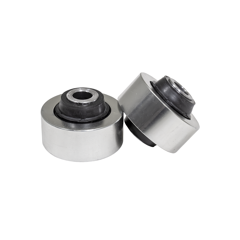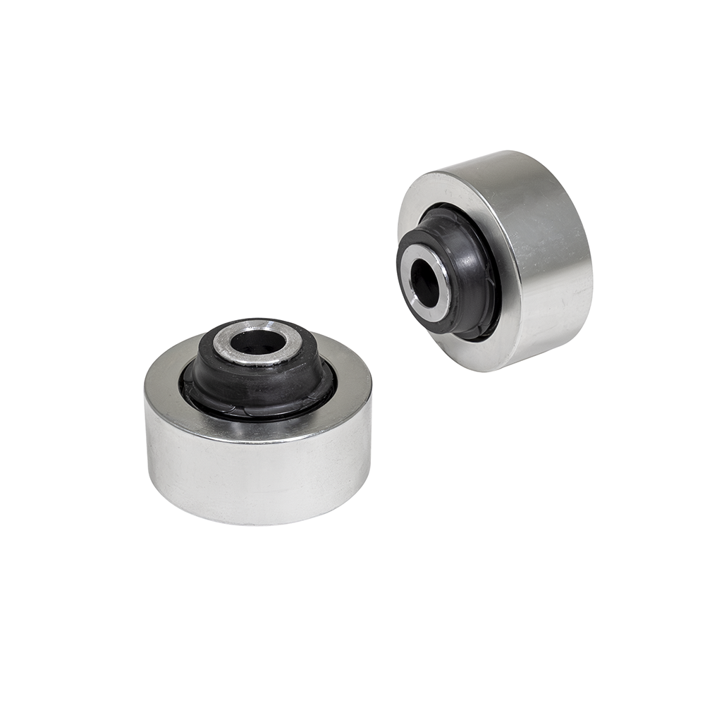 A spherical bearing uses a ball and socket design that resists deflection and flex under load, meaning more of the cornering forces are transferred to the strut/spring as intended, rather than a rubber bushing that will flex. When you're looking to get the most handling capability out of your vehicle, reducing the amount of rubber in the suspension is always a good idea. Since these bushings are a spherical bearing they may induce more NVH (noise, vibration, harshness) into the cabin; however they are sealed with a rubber boot so you do not have to worry about road salt and debris. These bushings are a step above our solid control arm bushings in terms of performance.
